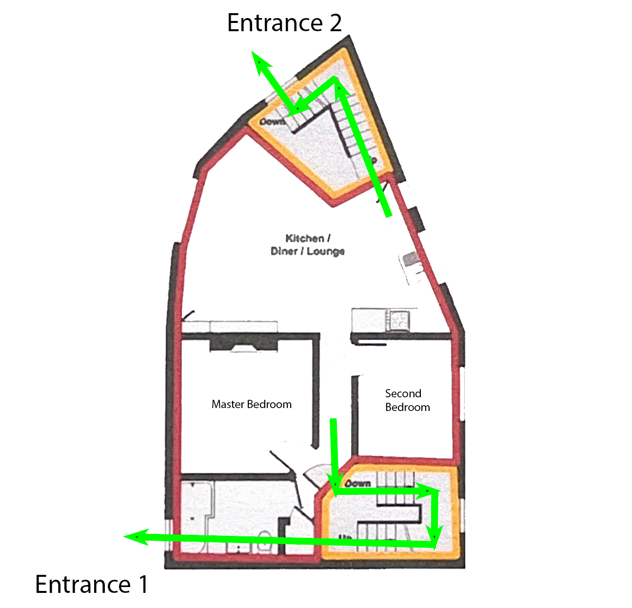 In the event of a fire, please leave by the nearest exit, as indicated by the green arrows: